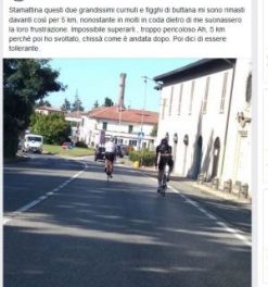 Mi riferisco, invece, alle fotografie che compaiono con grande regolarità sui social (e sono subito riprese dai giornali, si capisce) e che, normalmente, ritraggono il ciclista di fronte o oltre un semaforo. Segue la didascalia: ecco un altro eroe della domenica che non si ferma davanti al rosso. La variazione sul tema è rappresentata dall’immagine di un gruppo di ciclisti in movimento: guardate, occupano tutta la strada, non se ne può più. Il terzo esempio è quello della fotografia che trovate qui sotto e che, credetemi sulla parola, è apparso su una di queste pagine facebook. Idioti da tastiera, più che leoni.